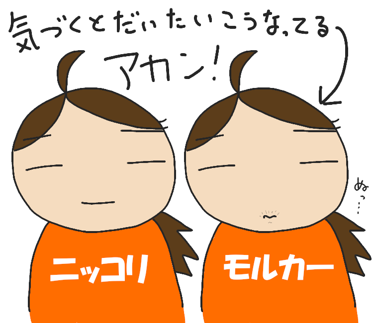 気づく度に、口の両端を斜め上に「ニー!」ってするけど、またすぐモルカーに戻ってもうてるもん……。
