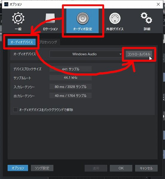 [オーディオ設定] → [オーディオデバイス] → [コントロールパネル]