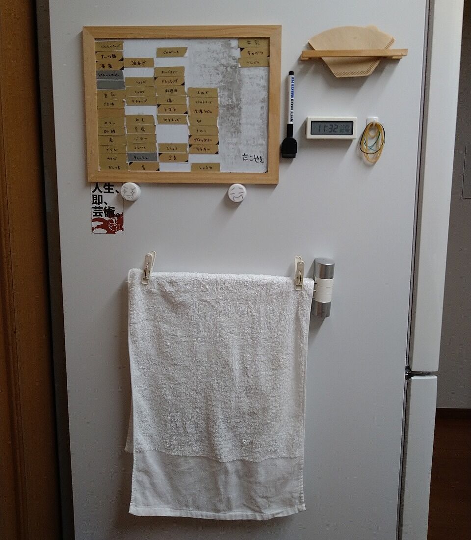 しゃーなし冷蔵庫の側面に磁石の布巾掛けをくっつけて