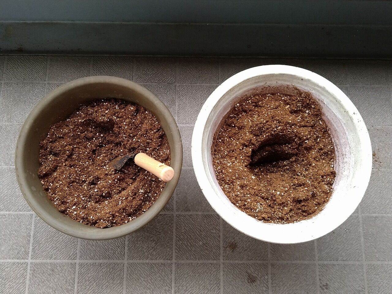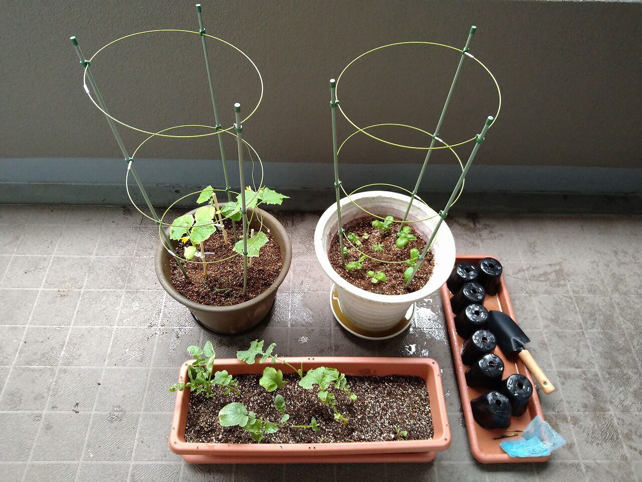 キュウリのポットは手前が1つで奥が2つ芽が出たんですけど、