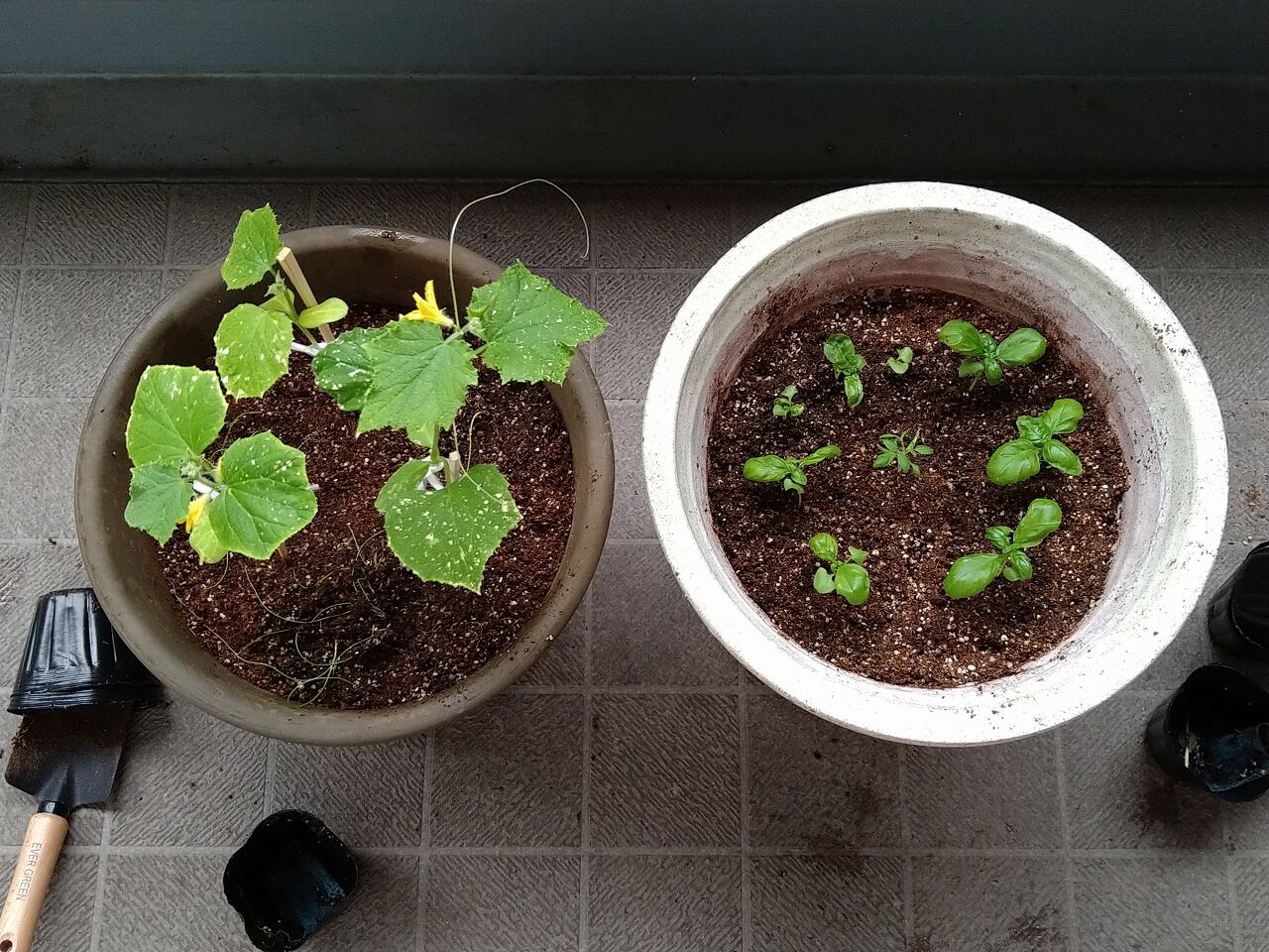 キュウリ&小ネギとトマト&バジルに分けて植えるんですけど、